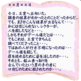 心から心配してくれる父に嘘をつくのはつらい。心の中で父に手を合わせ、フローラは急いで奥へと入っていった。そこには姉の部屋がある。姉はさっきどこかへ出かけたばかりだ。しばらくは戻らないはずだ。フローラは母の荷物が入っていると思われるチェストを開けた。思った通り、そこには見覚えのある母の遺品が入っていた。かき回したりすれば盗み見たのがばれてしまう。フローラは、はやる心を抑えながら、慎重に荷物を一つずつ見ていった。そして見つけたのは・・・何通かの手紙の束と、母がよく書いていた日記の束だった。