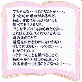 まさか・・・自分がこの手紙を盗み見るかも知れないから・・・!?いいえ・・・きっとそれは考えすぎだ・・・。自分が今、姉に内緒でこんなことをしているから、それでそんなことを考えてしまうんだ・・・。フローラは自分にそう言い聞かせ、先ほど引き抜いた手紙を丁寧に戻すと、手紙の束を諦めて母の日記をもう一度手に取った。だが日記の中は、どれもこれも他愛ない日常の出来事ばかりだった。でなければ収支明細か・・・。