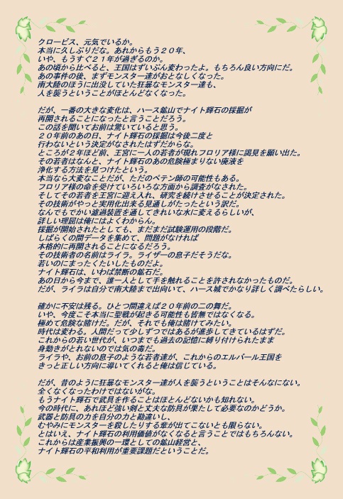 「希望か・・・。確かに、希望を持つことは大事だな・・・。正直に言うと・・・、そのあとしばらくして王宮内で色々あったからね。あまり思い出したくないこともあることはあるんだよ。」