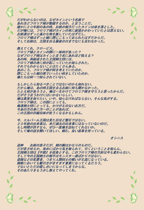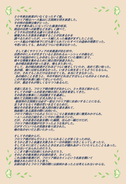 私の見た夢の中に出て来た声の主は・・・やはりフロリア様なのだろうか。カインを王国へ行かせたことが間違いだったというのか。カインという名を持つ王国剣士に出会ったことが、これほどフロリア様を動揺させることになろうとは私は夢にも思わなかった。