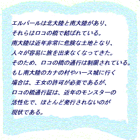 「でも心配事がないわけではないですね。最近あたりのモンスター達が、攻撃的かつ強くなっているような気がします。今まで見たことのない南大陸にしかいないようなモンスターまで、北大陸に来ていると聞きます・・・。この街は、南大陸のハース鉱山から様々な物資が送られてくる、いわばエルバールとハースをつなぐ中継点の役割も担っているのです。ところがロコの橋が封鎖されて以来、物資の運搬は減り続け、最近ではほとんど届かなくなってしまった。城下町では聖戦の噂でもちきりだそうですが、そんな恐ろしいものが本当に来るのでしょうかねぇ・・・。」