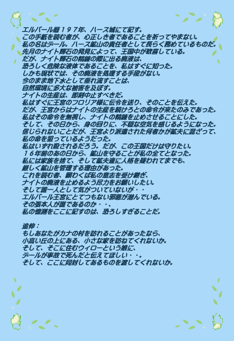 私は下になっている白骨の手から手紙を取り出した。既に骨だけになった指の間から、手紙はするりと抜けた。多分・・・死体が腐乱する過程で、一度この手紙は水分を含んだのだろう。紙はバリバリになっていたし、インクもあちこち滲んでいた。そして最後のほうはかなり文字が乱れている。それでも何とか読むことは出来そうだ。私はランプに手紙をかざし、私の隣で震えながら覗き込むウィローと共にその手紙を読み始めた。