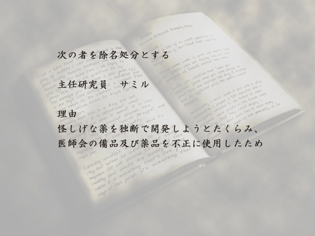 しつこく突っかかった私に、おじさんはそう言った。その表情がとても苦しげに見えたことに気づいていながら、あのときの私は頭に血が上っていて、それがなぜなのかを考えようともしなかった。今、やっとわかった。自分達の名前が表に出ることで、報告書そのものが闇に葬られてしまうことを恐れていたのだ。追放された研究者と追放された医師。その二人が結託して何かたくらんでいると思われたら、せっかく完成させた薬の有用性までも否定されかねない。時の医師会長がドゥルーガー会長であることは、もちろん知っていただろう。だが、会長の力がどの程度強いかなんてわからない。昔のよしみなんて何の意味も持たないだろうと、おじさんは考えたのだ・・・。