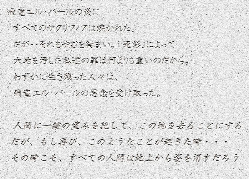 「サクリフィアが滅ぼされた理由は・・・ナイト輝石の廃液で大地を汚したから・・っていうことなのか・・・・。そのために聖戦竜達の逆鱗に触れて、滅ぼされた・・・。なるほどな、だからサクリフィアの人々は聖戦竜達を恨んだりしなかったってことか・・・。それならカフィールさん達が、聖戦竜を邪悪じゃないって言ってた意味が解るよ・・・。」