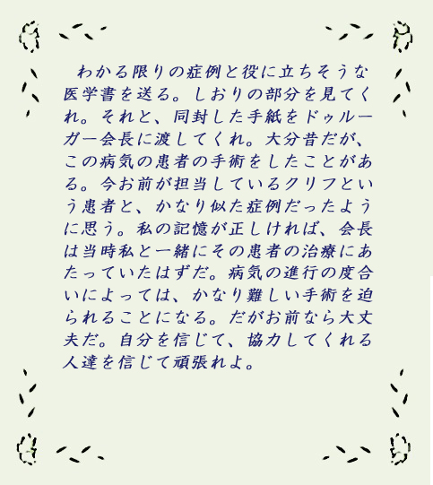 「ブロムは麻酔薬の開発を再開したいという話も手紙に書いておった。私はなおさら落胆した。サミル殿の人となりはそれほど知っていたわけではないが、医師会を辞めさせられたあとも研究を続けていたとブロムの手紙には書いてあった。あの逆境にもへこたれず研究を続けようとした、その不屈の精神は敬服に値する。もしこれが、ブロムがサミル殿の遺志を継ぐという話だったなら、私は心から応援した。今度こそ麻酔薬が完成するかも知れないと期待もしただろう。しかしいかにその子息とは言え、ついこの間まで医師とは何の関係もない職業に就いていた貴公が果たしてどこまでやれるのか、不安ばかりが先に立っていた・・・。」