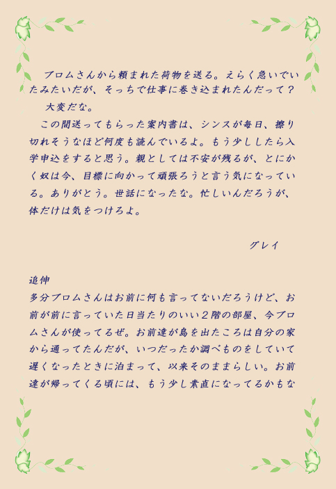 私は荷物を持ち上げて、部屋に戻った。確かに重い。送り主はグレイになっているが、私がブロムおじさん宛てに手紙を送ってから数日過ぎる。もしかしたら返事が入っているかも知れない。今すぐに開けて中を確かめたかったが、まずはゆっくりと食事をしよう。そう決めて、もう一度下に降りた。気持ちがはやる時ほど、冷静になれる時間を作らなければならない。