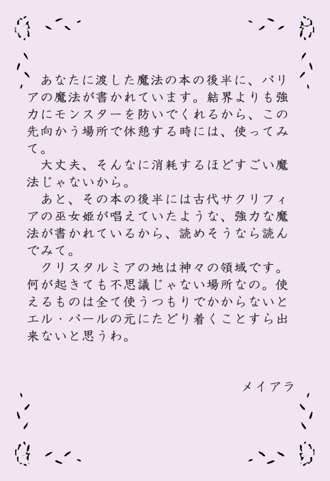 『導師』の言葉通り、海のモンスターはいっこうに現れず、私達は穏やかな海を順調に進んでいた。それなのに・・・私の心に重くのしかかる不安と孤独感は、ムーンシェイに近づくに連れてますます深くなっていった。カインは笑顔で冒険者達の船に乗った。そして遠くない再会を約束して去っていった。カインと離れて行動するのは初めてじゃないはずなのに、そしてカインは順調に旅を進めていると聞いているのに・・・それでも不安はぬぐい去れない・・・。